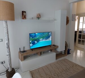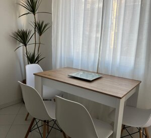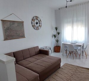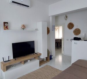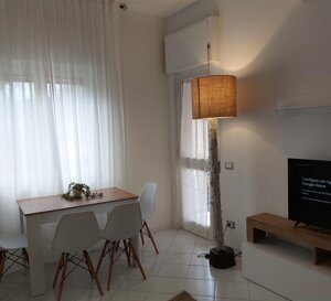Soggiorno con tavolo da pranzo, divano letto matrimoniale, smart TV ed accesso al balcone